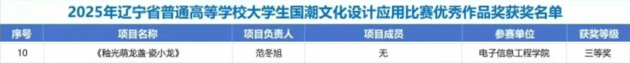 近日,由辽宁省教育厅主办,辽东学院承办的2025年辽宁省普通高等学校大学生国潮文化设计应用比赛落下帷幕。经过大会评审组层层筛选,共有384项作品成功入围,其中145项作品受邀参加了现场总决赛的最终评审。经过层层选拔与现场总决赛的激烈比拼,我院学子最终不负众望,荣获大赛三等奖。