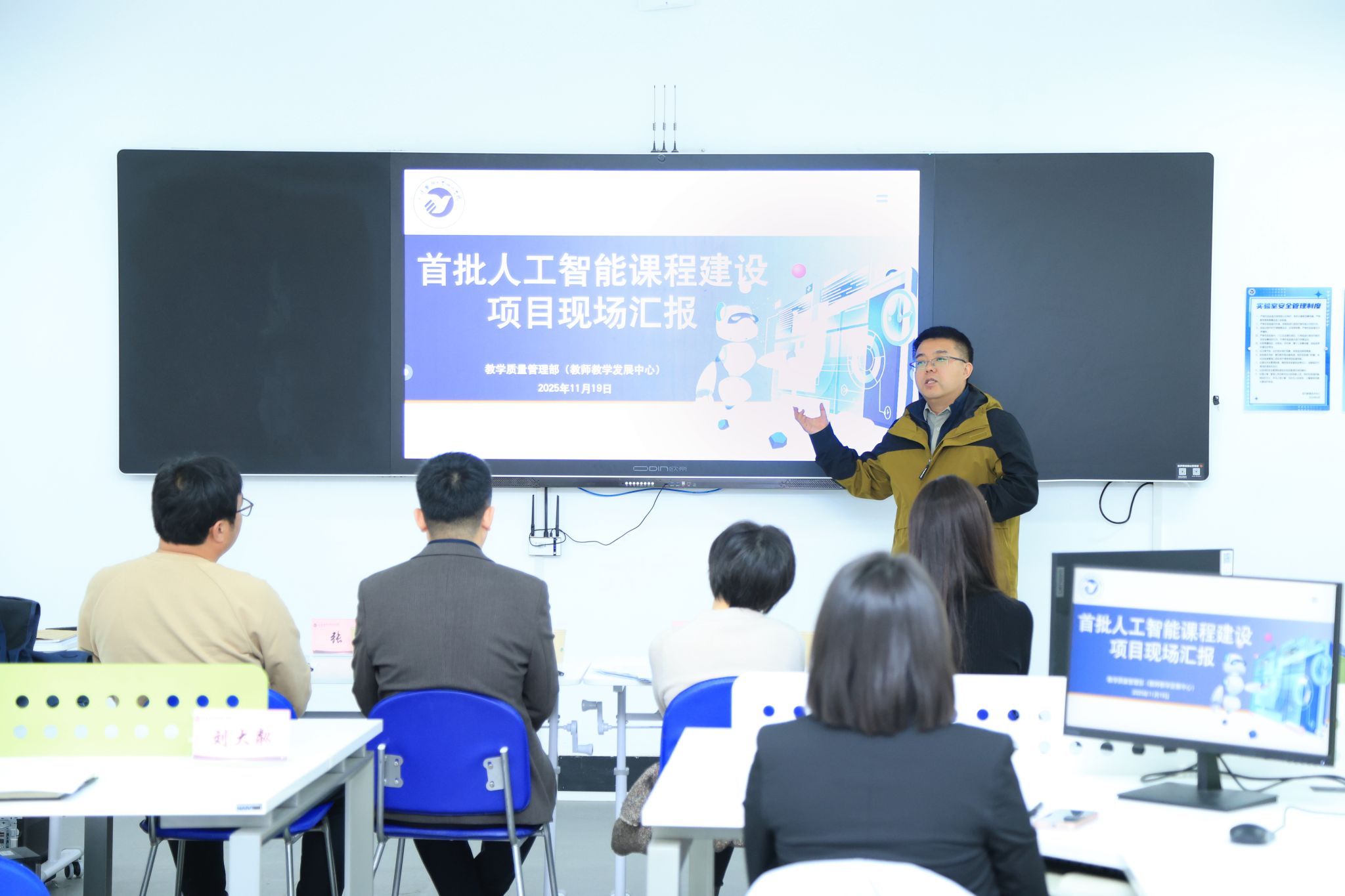 8位课程负责人围绕“AI赋能”这一核心主题,结合各自课程特点,系统展示了课程建设成果。汇报内容涵盖教学内容与方法创新、现有建设基础、AI技术赋能教学的具体路径以及预期成果展望等多个维度。专家组从课程设计的创新性、教学内容的实用性、建设方案的可行性等维度进行了全面评审,并就产教融合、实践教学等关键环节提出了专业建议。刘大粼在总结发言中充分肯定了各课程团队的建设成效,强调要继续深化人工智能与教育教学的融合创新。