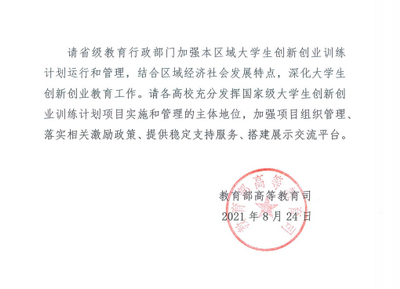 近日,从《教育部高等教育司关于公布2021年国家级大学生创新创业训练计划项目名单的通知》(教高司函[2021]13号)文件获悉,经我院申报,辽宁省教育厅组织专家评审、推荐,国家教育部高等教育司审核、批准,我院共有24项大学生创新创业训练项目获批2021年国家级大学生创新创业项目,其中创新训练项目16项、创业训练项目6项、创业实践项目2项。