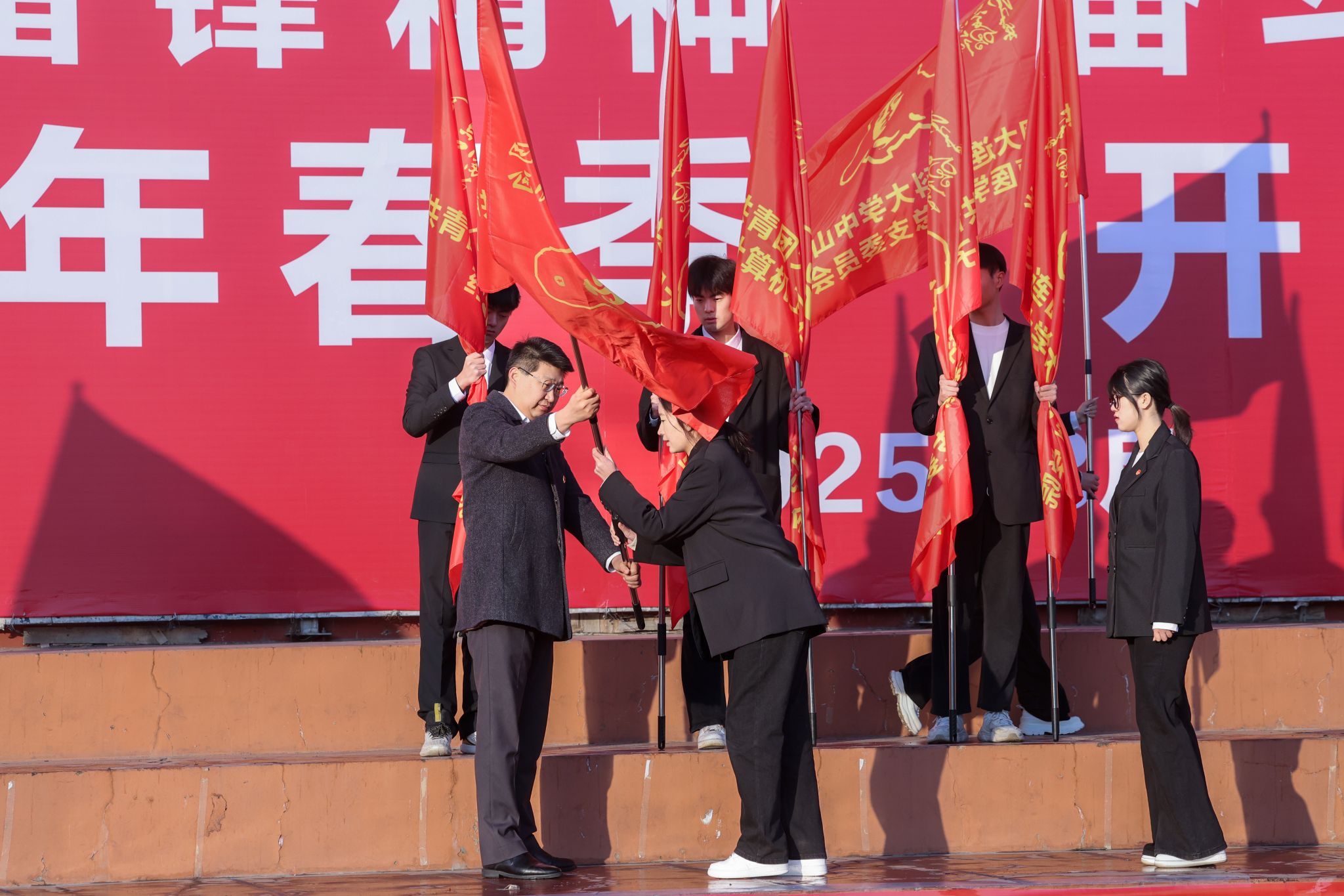 张鹏为各二级学院授旗帜。勉励同学们将学雷锋精神和志愿服务融入日常、化作经常,在雷锋精神的感召下,努力成长为新时代的雷锋式青年,以实际行动书写青春篇章。