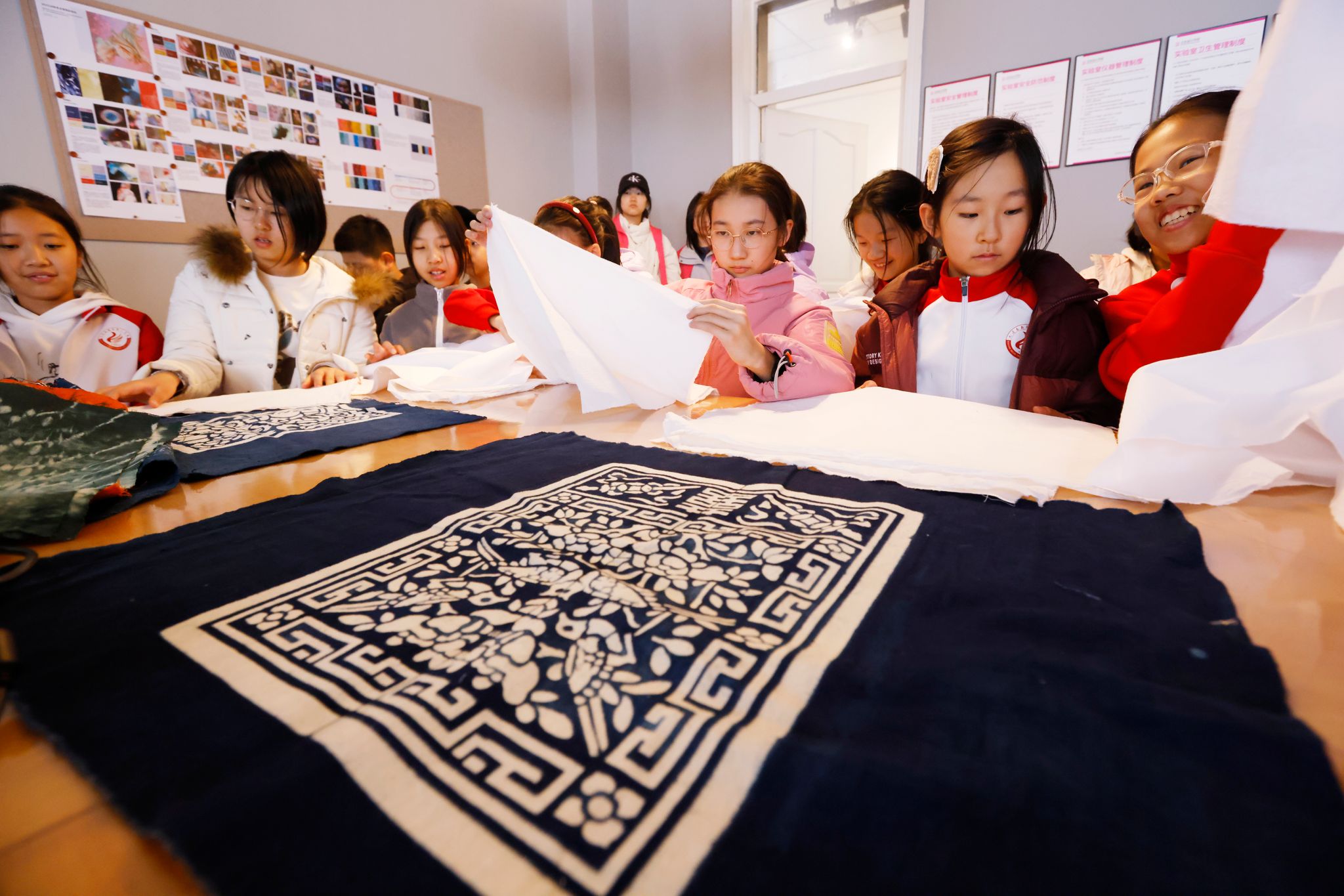参观结束后,学生们分别前往艺术设计学院简工作室和计算机工程学院信息技术实验室,亲身体验了手工扎染和AI绘画的乐趣。在简工作室,学生们在艺术设计学院杨晨副院长的指导下,学习扎染技艺,感受传统工艺的魅力。学生们按照老师讲解的制作方法,将白色布料通过折叠、捆绑、染色等步骤,制作出各具特色的扎染作品。看着自己亲手制作的扎染作品,学生们脸上洋溢着自豪和喜悦的笑容。