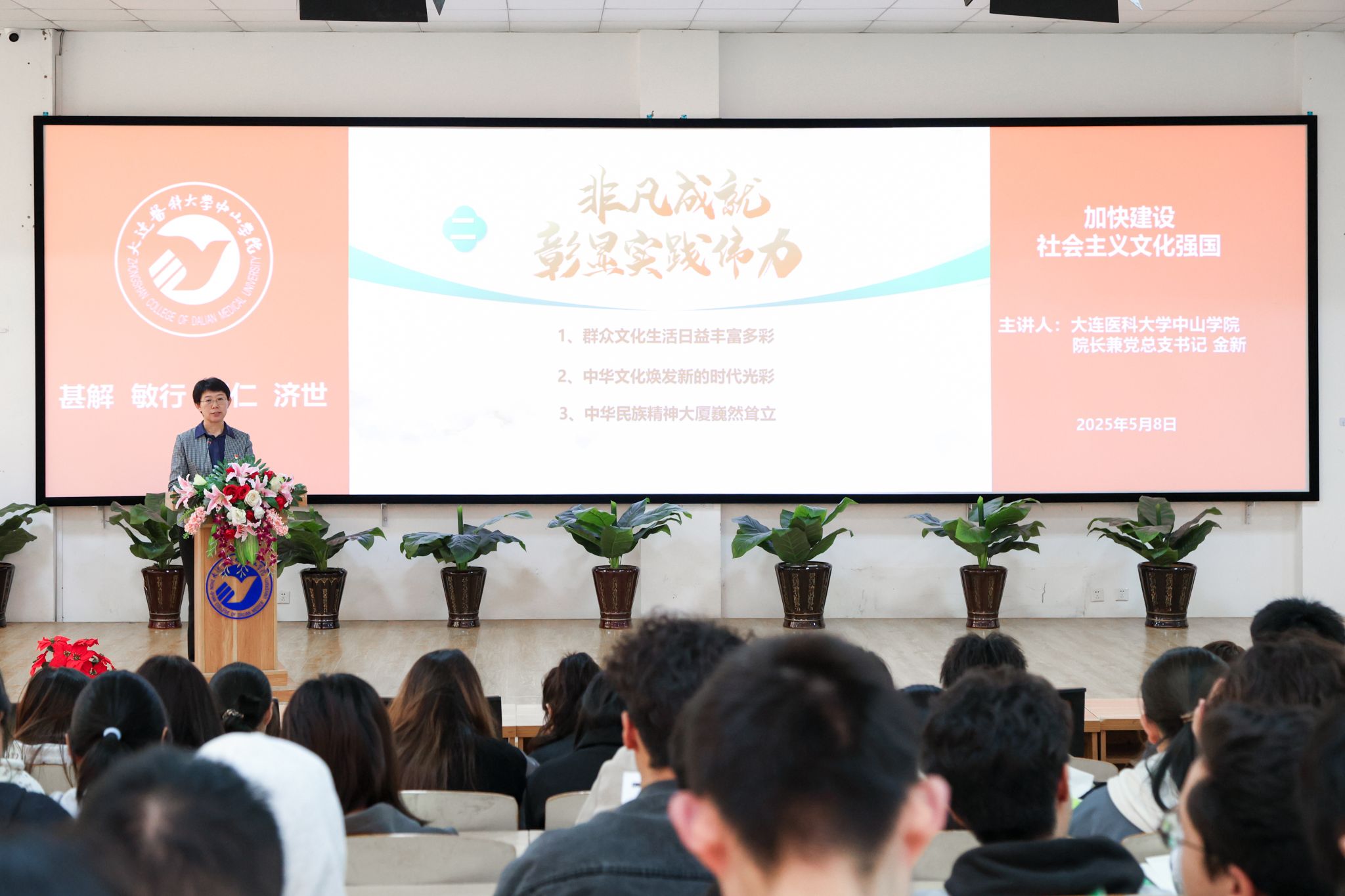 金新以《加快建设社会主义文化强国》为题,通过四个必然要求,强调加快建设社会主义文化强国的必要性;通过典型的案例和精彩的图片、视频,让学生感受在建设社会主义文化强国进程中取得的成就;通过带领学生学习习近平文化思想的核心要义,指出未来加快建设社会主义文化强国的方向和做法。最后,结合新时代大学生成长成才的实际,金新提出,希望同学们能够厚植文化情怀、强化文化担当、坚定文化自信,积极投身中国特色社会主义文化建设实践中来,为建设社会主义文化强国贡献青春力量。