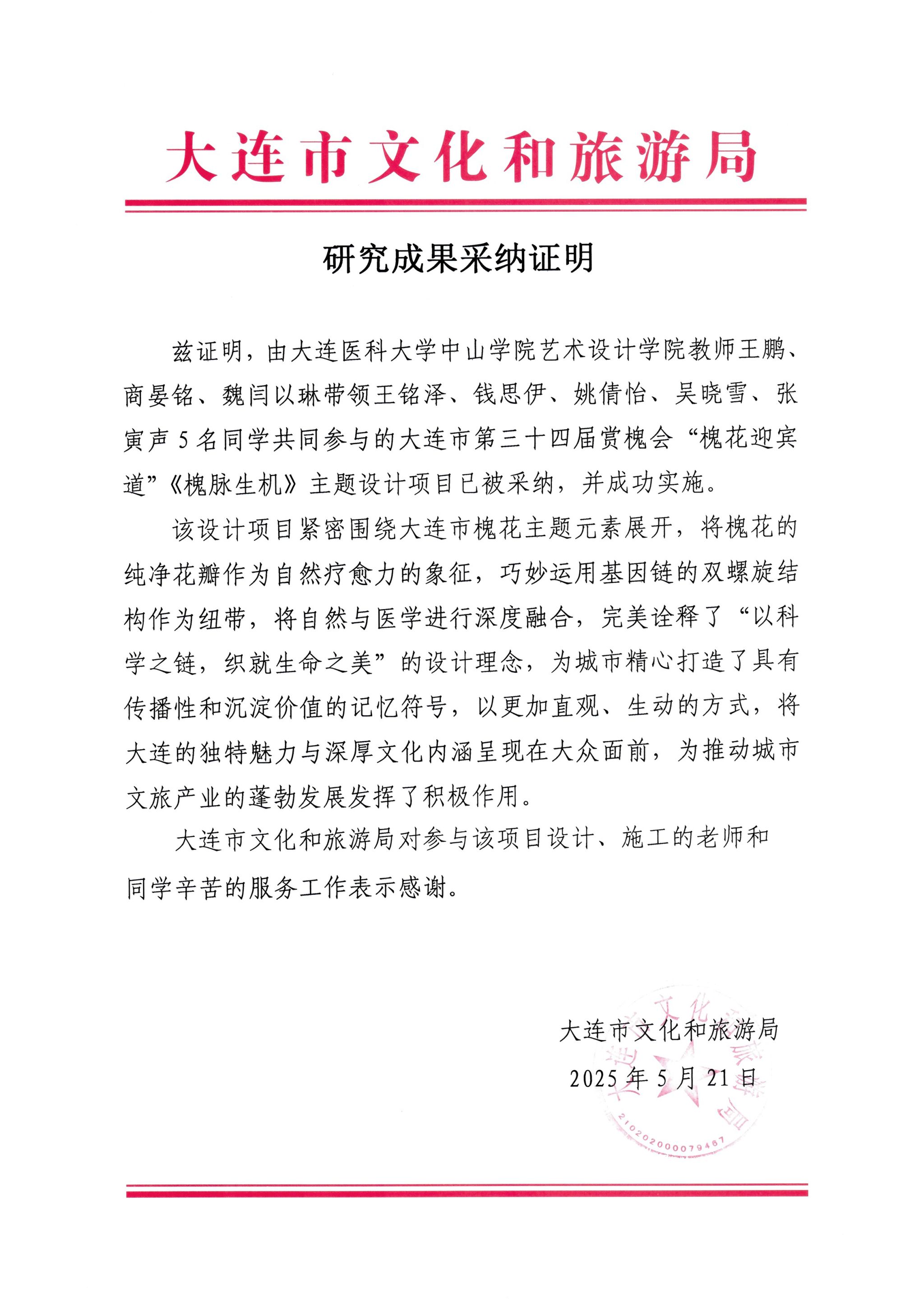 2025年5月17日,第三十四届大连赏槐会这一备受瞩目的城市文化盛事,在东港音乐喷泉广场盛大启幕。由beat365艺术设计学院教师王鹏、商晏铭、魏闫以琳带领王铭泽、钱思伊、姚倩怡、吴晓雪、张寅声5名同学共同创作的赏槐会“槐花迎宾道”主题设计项目——《槐脉生机》,在众多参赛作品中脱颖而出,被大会正式采纳并成功实施。
