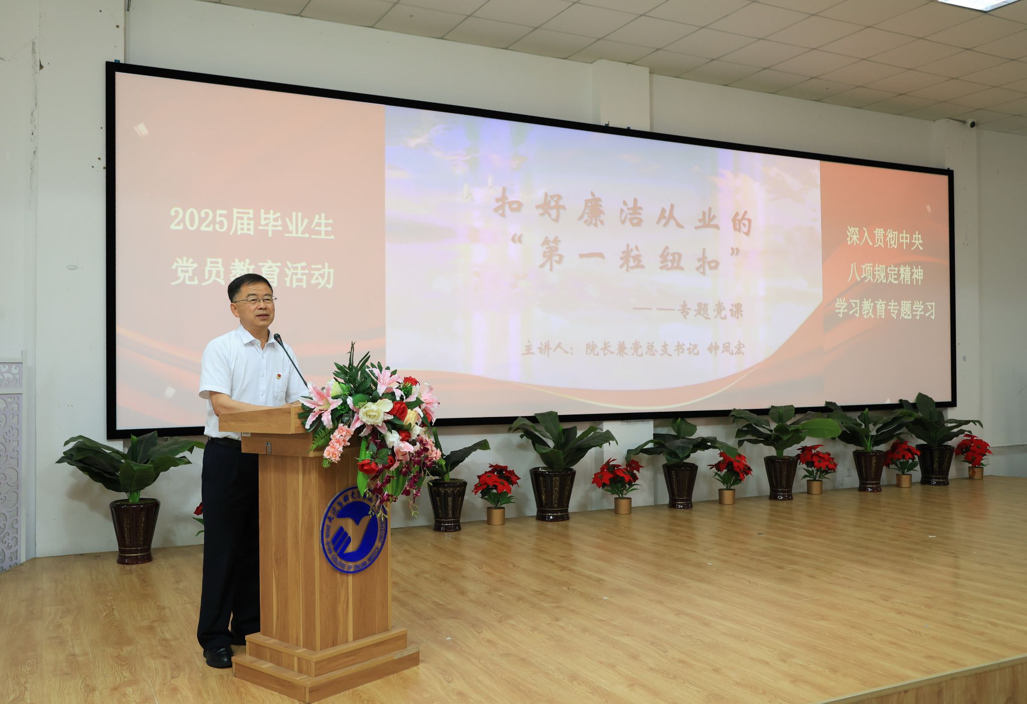 6月17日,院长兼党总支书记钟凤宏以《扣好廉洁从业的“第一粒纽扣”》为题,向全体毕业生党员讲授专题党课。党课紧密结合中央八项规定精神的核心要求,通过剖析典型案例,深刻阐释了新时代加强作风建设的重要意义。他强调,全体党员要以案为鉴,时刻绷紧纪律之弦,做到心有所畏、言有所戒、行有所止。