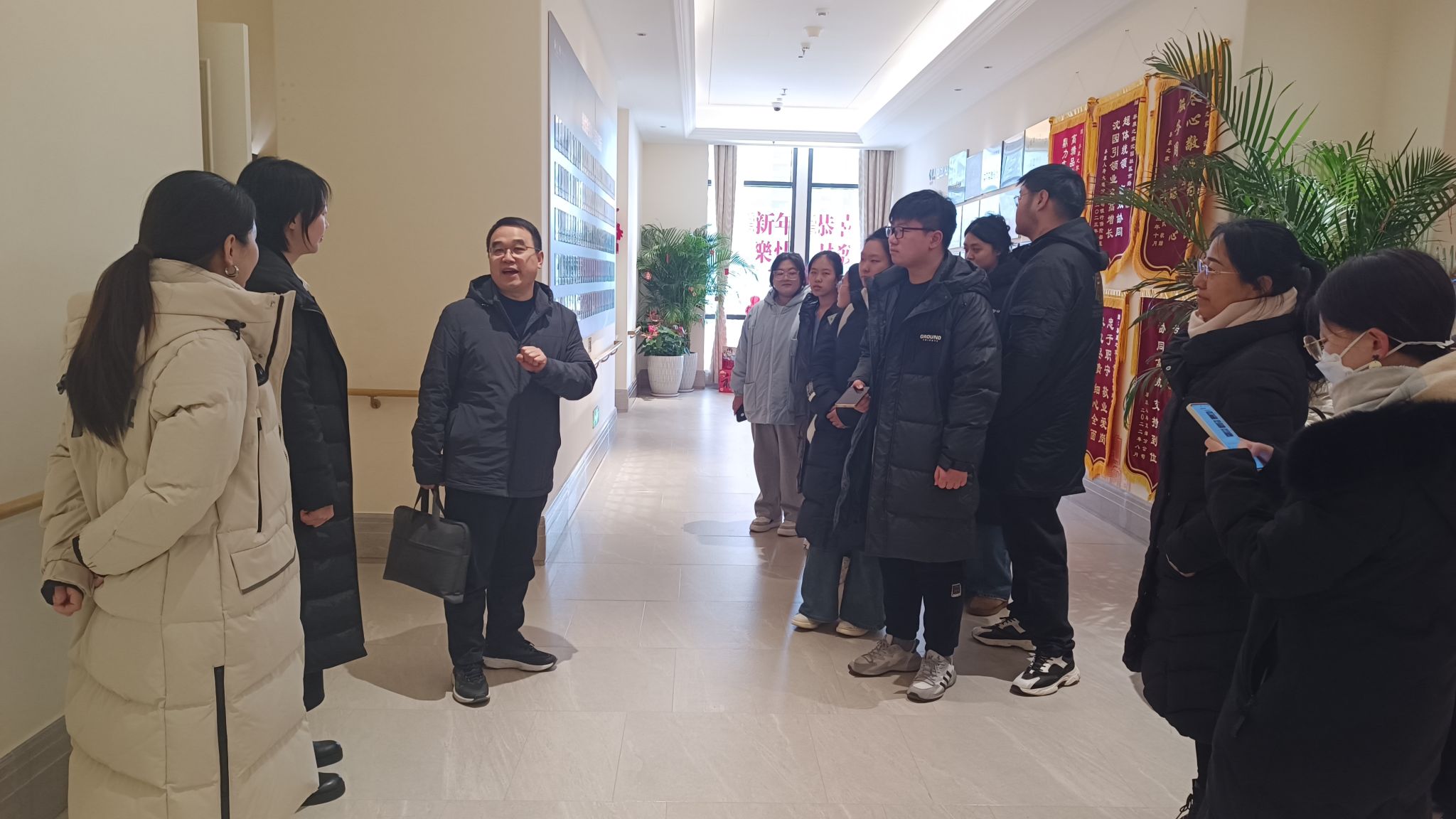 为践行高等教育人才培养与社会产业协同发展,提升管理学子实践能力和职业素养,拓展beat365学子实习就业渠道,增强学生职业规划意识。管理学院院长罗锦辉、副院长张艳华、教师侯姝婷和辅导员曾鹏翰于2025年1月15日组织沈阳本地学生参访沈阳市泰康之家沈园,开展实习基地走访和访企拓岗专项工作,探索康养产业新未来。