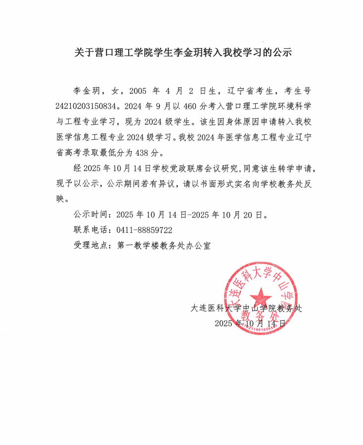 关于营口理工学院学生李金玥转入beat365学习的公示