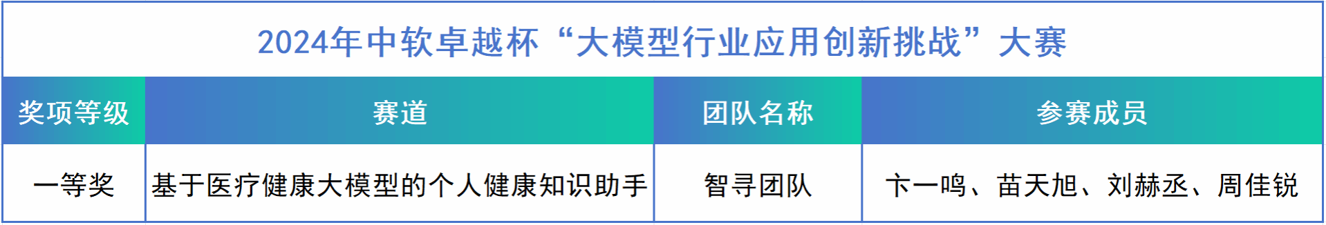 “智寻”团队开发的项目是“基于医疗健康大模型的个人健康知识助手”,利用先进的算法技术,构建了一个医学教学大模型,为医学文献阅读、病例整理提供了便利,助力医疗服务与教学智能化发展。在三个月的漫长备赛中,团队成员与指导教师密切沟通,不断优化与完善作品,在初赛脱颖而出,成功入围28强,并在最终决赛中展现了强大的应用能力、专业素养和创新思维,一举夺魁。