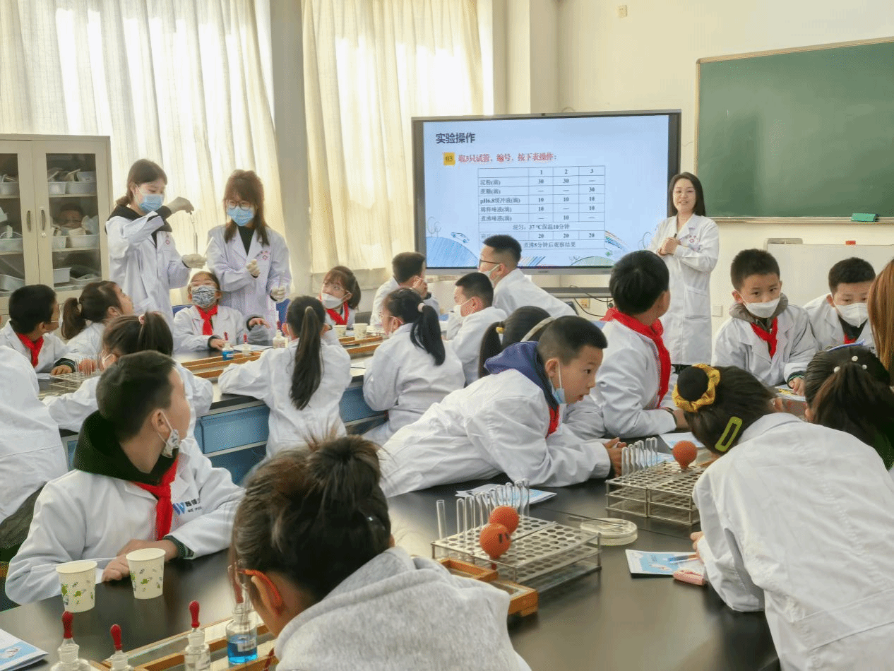 本次研学课程共设置了三个模块。在应用技术学院实验室,教师宋利华以“嚼馒头为何会变甜”的生活现象切入,通过生动的比喻与通俗易懂的讲解,为小朋友们揭开酶特异性催化作用的奥秘。在应用技术学院学生助教的带领下,大家规范使用试管、滴管,观察反应进程,极大地激发了他们对于科学的兴趣,不少小朋友在研学手册上写下“未来要从事医学研究”的志向。