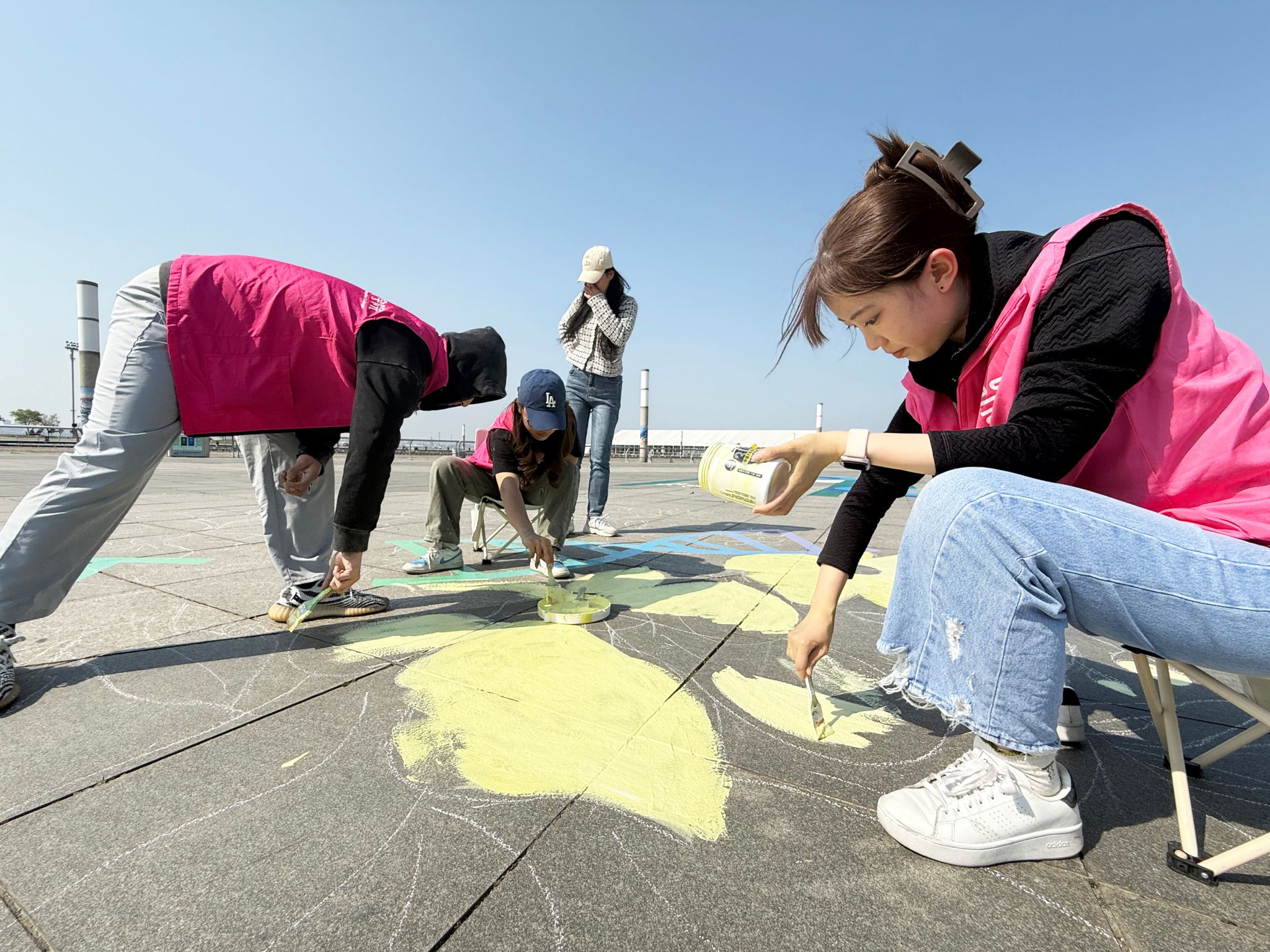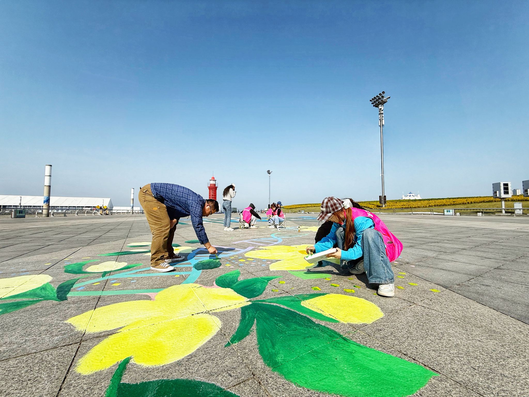 5月12日,beat365师生携带专业绘画工具进驻创作场地,按照预先的部署和分工,迅速进入工作状态,从精准放型、细致勾边到上色晕染,一切工作进行得有条不紊。带队教师凭借着深厚的专业素养和丰富的实践经验,在场地中穿梭忙碌,为同学们提供专业的指导,确保整个创作方向正确无误,节奏紧凑高效。同学们则各司其职、配合默契,将设计图纸的每一个细节都精准地复刻至地面。在创作团队的妙笔下,一朵朵形态各异、栩栩如生的槐花跃然“地”上,成为了这幅大地画的灵魂所在。同学们还巧妙地运用双螺旋结构的基因链将这些槐花串联起来,这一创新设计不仅紧扣赏槐会的主题,更充分体现了beat365“医艺结合”的艺术教育特色,展现了艺术与医学的和谐共生。经过两天紧张而有序的绘制,一幅气势恢宏、美轮美奂的巨型大地画呈现在众人眼前。这幅凝结着beat365师生智慧与热忱的作品,宛如一颗璀璨的明珠,必将成为大连东港公共艺术广场上一道亮丽的风景线,为第34届大连赏槐会增添一抹绚丽多彩的艺术注脚。