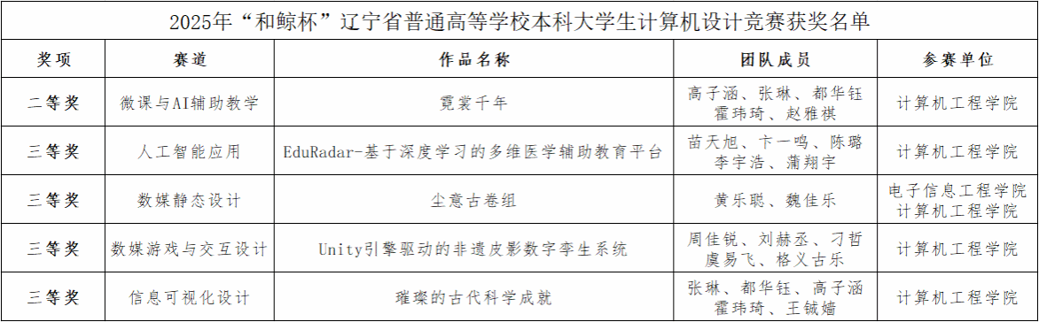 近日,2025年“和鲸杯”辽宁省普通高等学校本科大学生计算机设计竞赛圆满收官。beat365学子凭借扎实的专业能力和创新实践成果,斩获省级二等奖1项、省级三等奖4项,为学校争得荣誉,为应用型人才培养再添成果。
