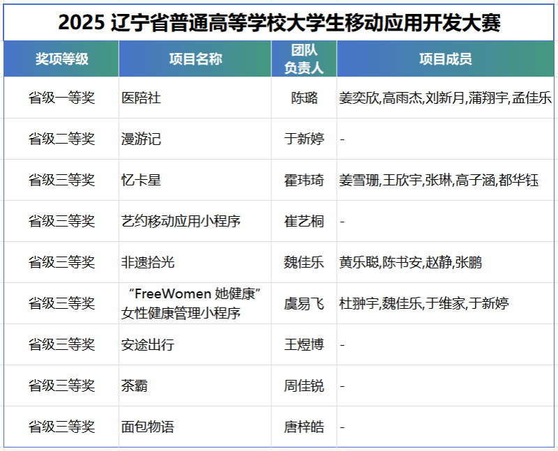 近日,由辽宁省教育厅主办,大连交通大学承办的2025年辽宁省普通高等学校大学生移动应用开发大赛圆满落幕。计算机工程学院学子在大赛中表现出色,荣获省级一等奖1项、二等奖1项、三等奖7项的优异成绩。此次比赛充分展示了我院学子在移动应用开发领域的专业技能和创新能力。