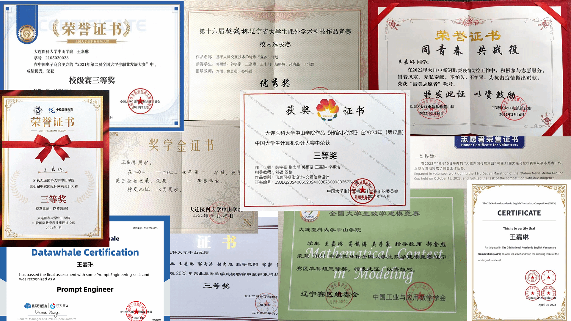 在辽宁省第二届大学生职业规划大赛中,王嘉琳凭借扎实的专业积累和丰富的竞赛经验斩获佳绩,一路走来,她用沉甸甸的竞赛证书记录着成长的足迹: