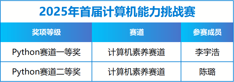 近日,由大连市计算机学会、苏州市计算机学会、天津市计算机学会联合主办的2025年计算机能力竞赛暨城市联赛圆满落幕。我院学子在大赛中发挥出色,2023级计算机科学与技术专业李宇浩获得计算机素养赛道Python编程一等奖,陈璐获得计算机素养赛道Python编程二等奖。