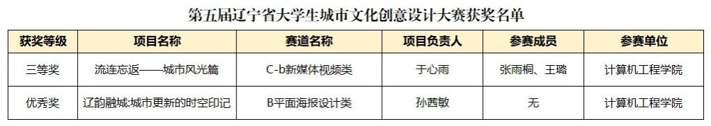 近日,由辽宁省教育厅主办,沈阳城市建设学院承办的第五届辽宁省大学生城市文化创意设计大赛圆满结束。我院学子荣获三等奖1项、优秀奖1项。大赛以城市文化为主题,聚焦于城市文化的深邃内涵,为高校与城市发展同频共振、互促共进搭建桥梁,为推动城市文化繁荣和发展贡献力量。