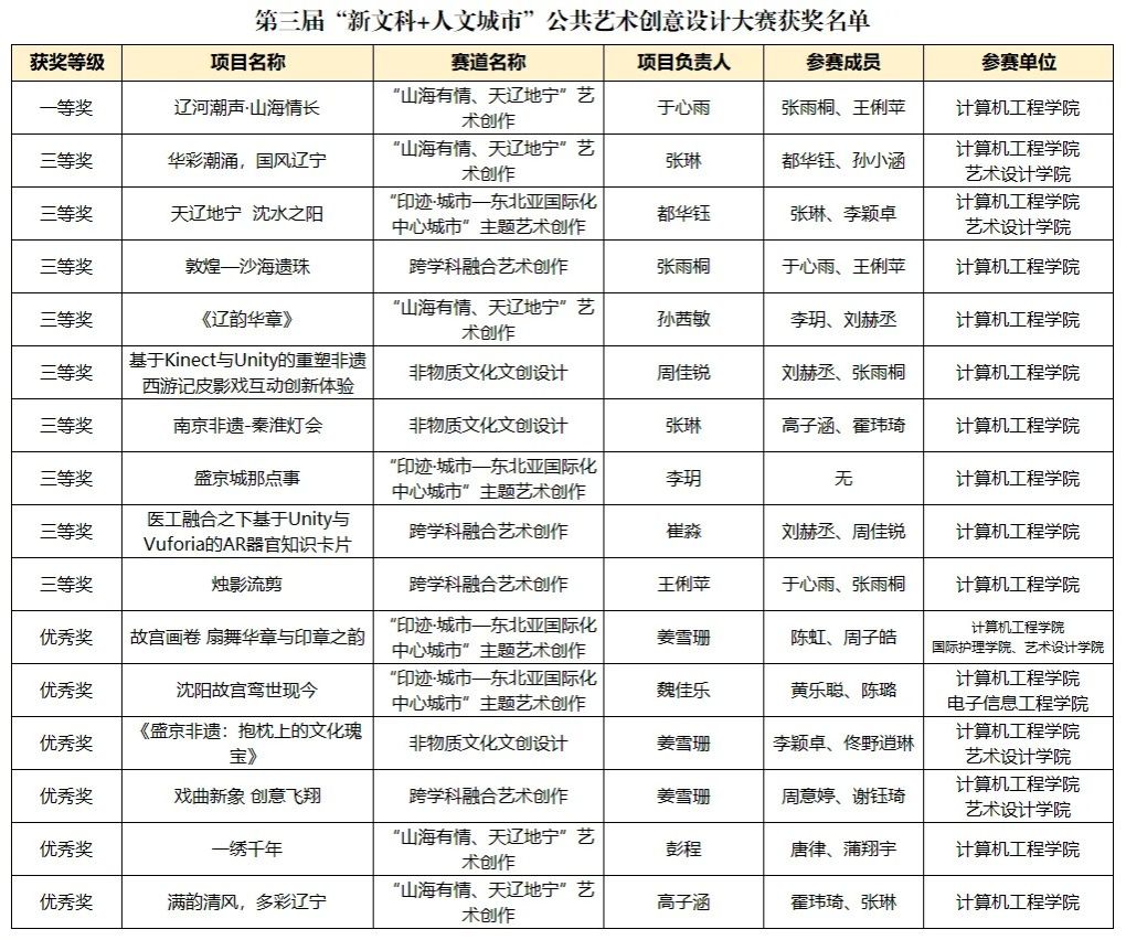 由辽宁省教育厅主办、沈阳大学承办的第三届 “新文科 + 人文城市” 公共艺术创意设计大赛已圆满落下帷幕。我院学子表现出色,共荣获一等奖1项、三等奖9项、优秀奖6项。其中,多个获奖团队来自计算机工程学院与艺术设计学院携手共建的艺工融合工作室。这充分展示了两院跨学科合作模式的新成效,进一步促进了“艺工结合”创新型人才的培养。