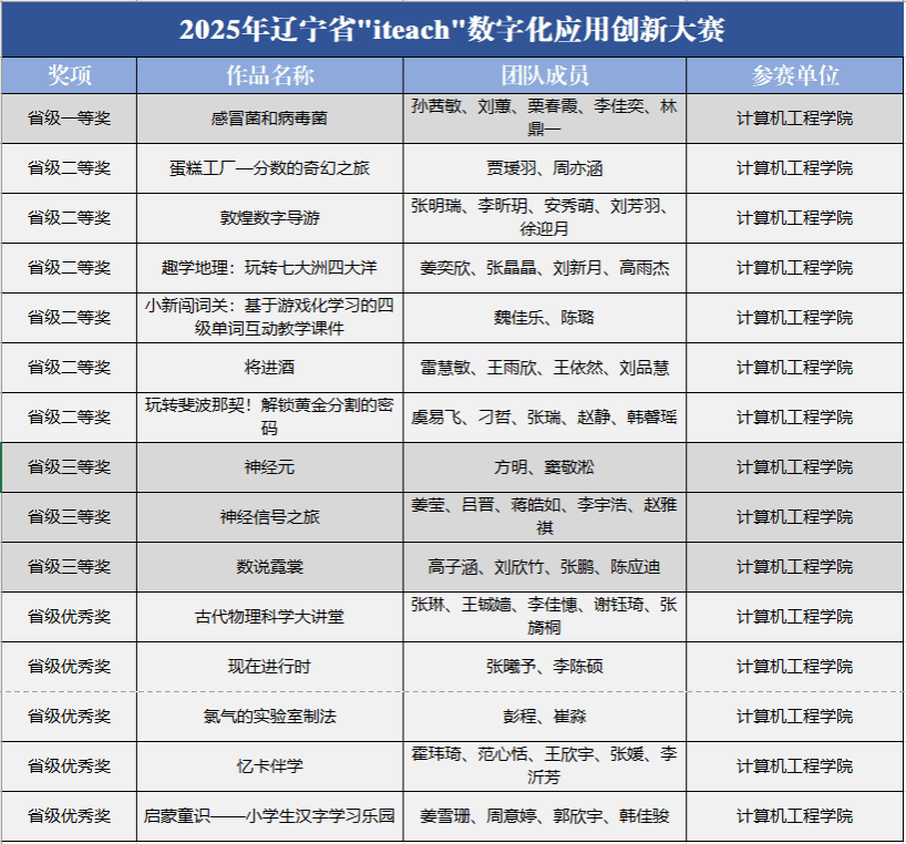 近日,由辽宁省教育厅主办,渤海大学承办的2025年“iTeach”辽宁省大学生数字化教育应用创新大赛圆满落幕。在本届大赛中,我院学子与来自全省各高校的优秀队伍同台竞技、交流学习,最终喜获省级一等奖1项、二等奖6项、三等奖3项、优秀奖5项,获奖总人数达56人!
