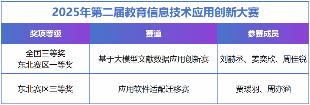 近日,由中国教育技术协会主办,浙江大学、中国教育技术协会承办的2025年第二届教育信息技术应用创新大赛圆满落幕。我院学子凭借扎实的技术功底与出色的创新能力崭露头角,在全国732所教育行政单位和高校、2474支参赛队伍的激烈角逐中脱颖而出。由刘赫丞、姜奕欣及周佳锐组成的团队,荣获全国三等奖暨东北赛区一等奖;由贾瑷羽、周亦涵组成的团队荣获东北赛区三等奖。