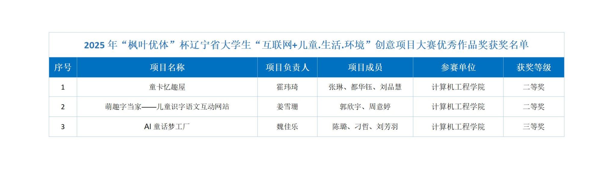 由辽宁省教育厅主办、沈阳师范大学承办的2025年“枫叶优体”杯辽宁省大学生“互联网+儿童·生活·环境”创意项目大赛于9月5日正式启动,经过初赛、复赛、决赛的激烈角逐,近日圆满落下帷幕。我院学子共荣获省级二等奖2项,三等奖1项。