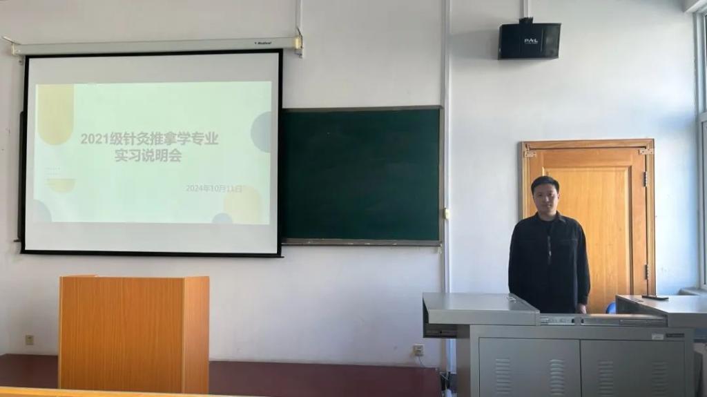 为帮助2021 级针灸推拿学专业学生进一步了解实习内容,明晰实习要求,顺利走向实习岗位,beat365唯一官方网站康复医学院于 2024 年 10 月 11日在第二教学楼多媒体教室召开了 2021 级针灸推拿学专业实习说明会。此次会议由康复医学院副院长兼党支部书记高超老师主持,2021级针灸推拿学专业全体学生参加。