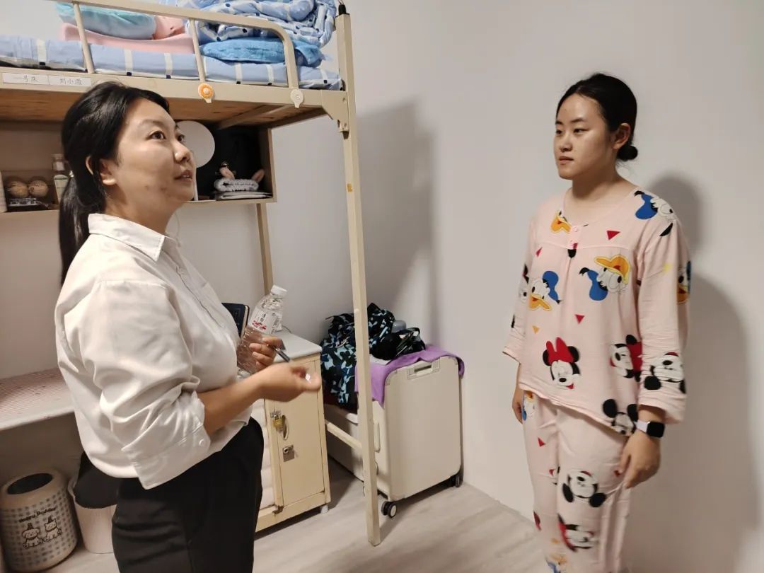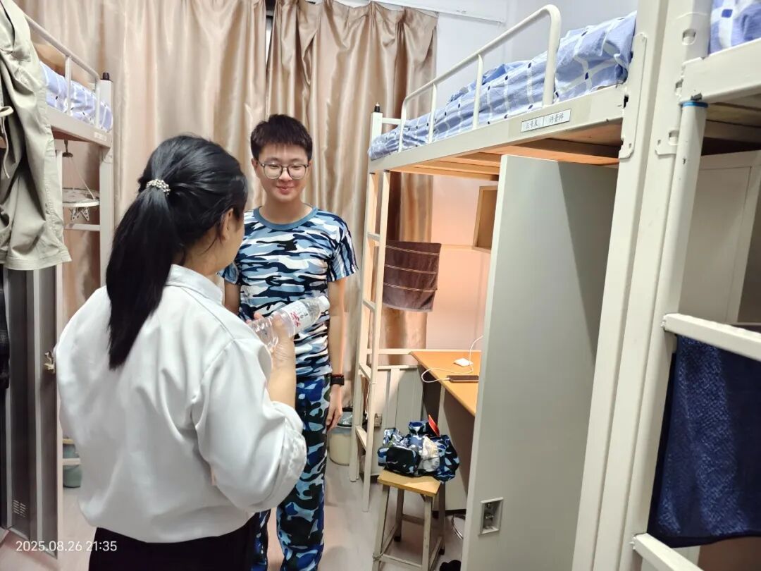 21:00,迎新日的尾声,辅导员老师石丽芬带着关怀走进新生寝室。她仔细查看住宿环境,询问同学们是否有生活上的不便,小到床铺整理、物品收纳,大到用电安全、作息安排,都一一贴心叮嘱。一句句温暖的问候,让陌生的宿舍渐渐有了“家”的味道。